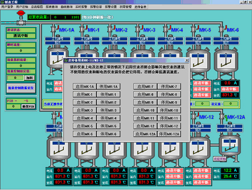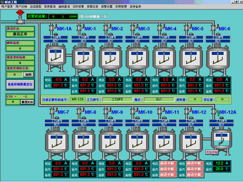 整個(gè)系統(tǒng)主要由一臺(tái)AI-708H控制14個(gè)反應(yīng)釜的批量進(jìn)料,分別由7臺(tái)AI-704M和7臺(tái)AI-501精確測(cè)量反應(yīng)釜的溫度和電機(jī)的電流,所有這些都在主控PC上進(jìn)行控制和顯示,并由軟件記錄并保存數(shù)據(jù)。