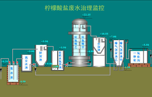 宜興協(xié)聯(lián)檸檬酸廢水處理廠采用厭氧加好氧處理工藝,其中好氧部分采用SBR法處理。SBR是處理高濃度有機廢水的理想途徑之一。一期設計日處理100立方/小時,設2座爆氣池2座厭氧塔,氧化溝,有機調(diào)節(jié)池等12座處理池。控制設備布置分散,要求實現(xiàn)總線型遠程檢測控制。